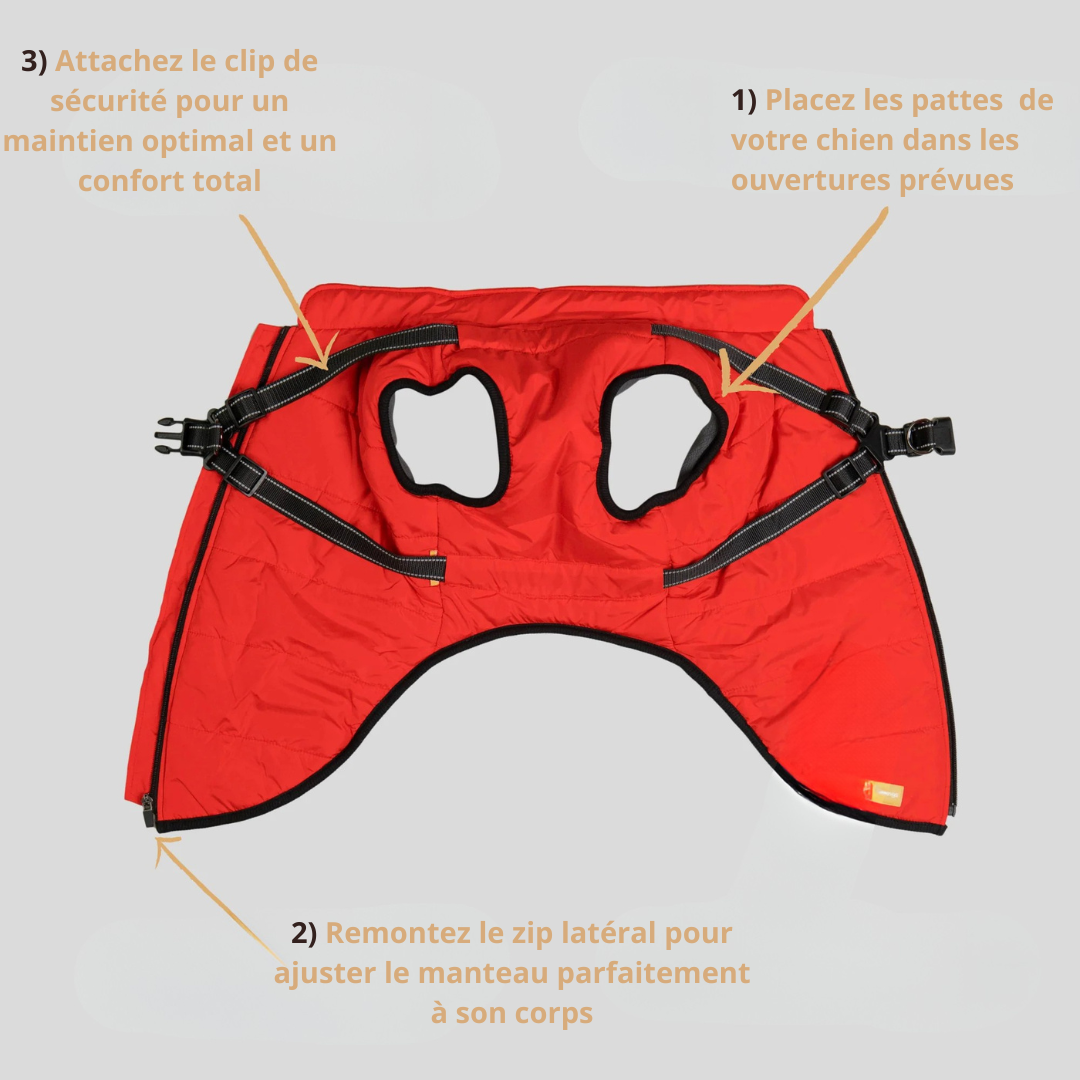 le manteau s’enfile en quelques secondes, sans stresser votre chien.